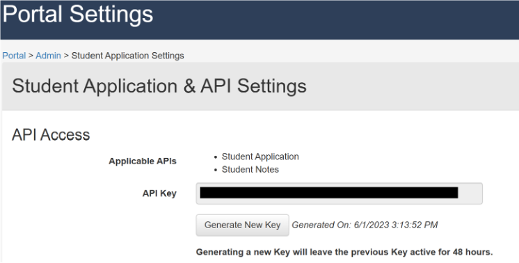 - Note: It uses the same API Key as the Student Application endpoint, which can be managed by web-admins via the following setting:
